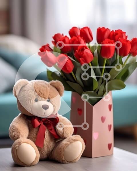 Intra Συλλεκτικό Ξύλινο Παζλ Plywood 4mm – Αρκουδάκι του Αγίου Βαλεντίνου με κόκκινες τουλίπες Σε Ξύλινο Κουτί – Διαστάσεις Puzzle: 10×10 cm – 25 κομμάτια
