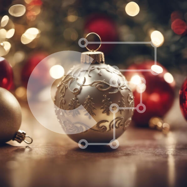 Intra Συλλεκτικό Ξύλινο Παζλ Plywood 4mm – Ασημένια και χρυσά στολίδια σε ξύλινο τραπέζι με κόκκινα και λευκά διακοσμητικά Σε Ξύλινο Κουτί – Διαστάσεις: 10×10 cm – 25 κομμάτια