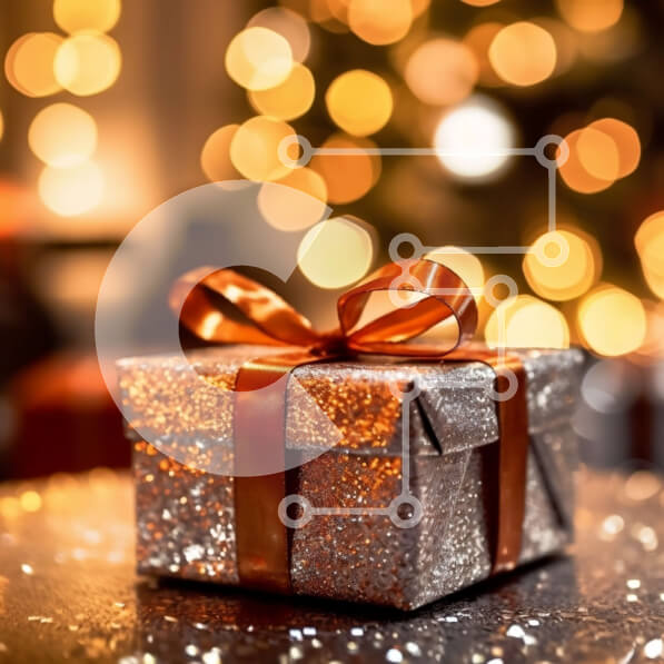 Intra Συλλεκτικό Ξύλινο Παζλ Plywood 4mm – Ασημένιο κουτί δώρου με κόκκινη κορδέλα στο τραπέζι μπροστά από το χριστουγεννιάτικο δέντρο Σε Ξύλινο Κουτί – Διαστάσεις: 10×10 cm – 25 κομμάτια