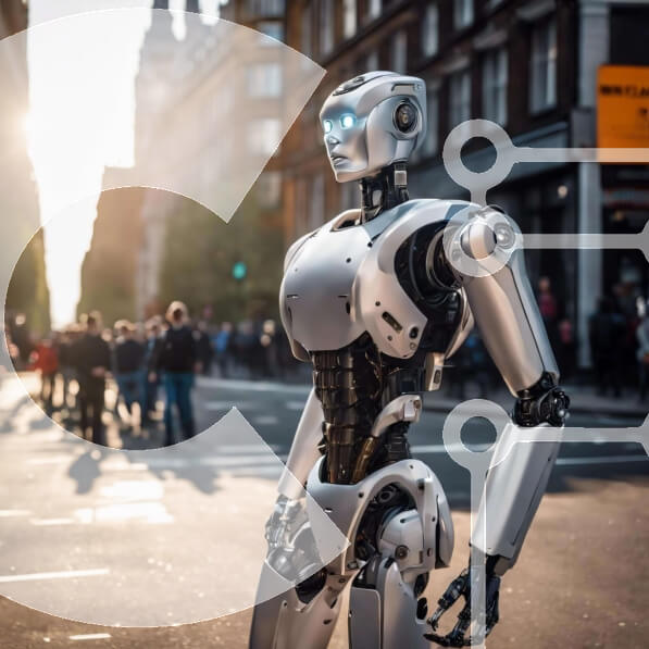 Intra Συλλεκτικό Ξύλινο Παζλ Plywood 4mm – Ασημένιο ρομπότ στην αστική οδό με ανθρώπους και οχήματα Σε Ξύλινο Κουτί – Διαστάσεις Puzzle: 10×10 cm – 25 κομμάτια