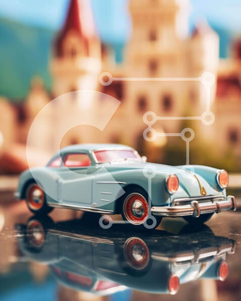 Intra Συλλεκτικό Ξύλινο Παζλ Plywood 4mm – Αυτοκίνητο παιχνίδι σε γυάλινη επιφάνεια μπροστά από το Κάστρο Σε Ξύλινο Κουτί – Διαστάσεις: 10×10 cm – 25 κομμάτια