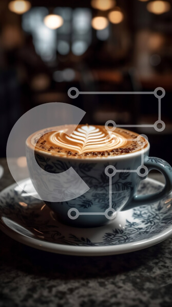 Intra Συλλεκτικό Ξύλινο Παζλ Plywood 4mm – Αφρώδης καπουτσίνο σε μπλε και άσπρο κεραμικό κύπελλο με σχέδιο φύλλων σε ξύλινο τραπέζι μπροστά από τη θέα της πόλης τη νύχτα Σε Ξύλινο Κουτί – Διαστάσεις: 10×10 cm – 25 κομμάτια