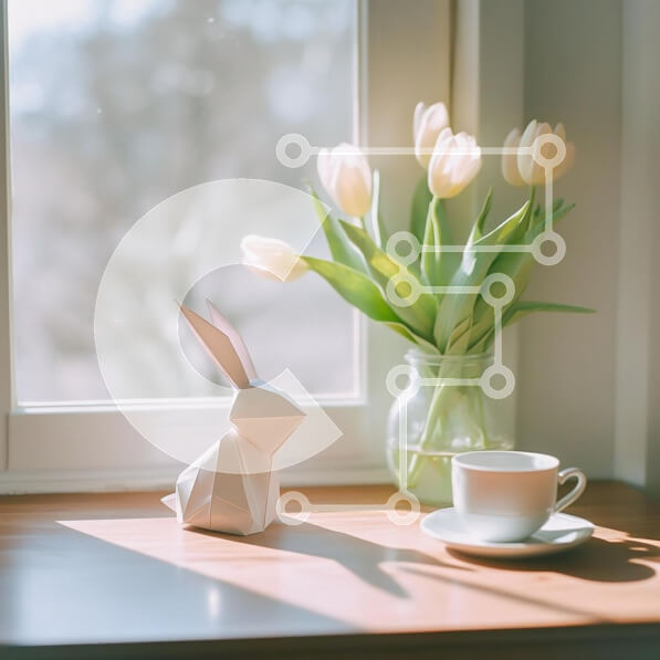 Intra Συλλεκτικό Ξύλινο Παζλ Plywood 4mm – Γαλήνια σκηνή εσωτερικού χώρου με κουνέλι Origami και τουλίπες Σε Ξύλινο Κουτί – Διαστάσεις Puzzle: 10×10 cm – 25 κομμάτια