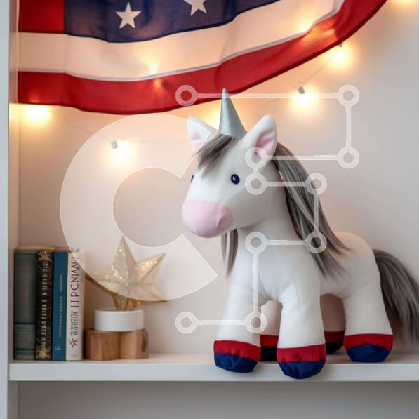 Intra Συλλεκτικό Ξύλινο Παζλ Plywood 4mm – Γεμιστός μονόκερος σε αμερικανική σημαία και ράφι Σε Ξύλινο Κουτί – Διαστάσεις Puzzle: 10×10 cm – 25 κομμάτια
