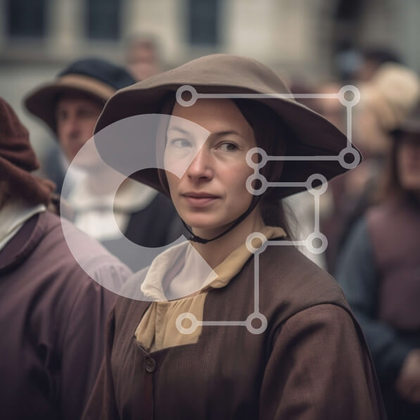 Intra Συλλεκτικό Ξύλινο Παζλ Plywood 4mm – Γυναίκα με καφέ καπέλο και φόρεμα ανάμεσα σε μια ομάδα ανθρώπων με ρούχα περιόδου Σε Ξύλινο Κουτί – Διαστάσεις Puzzle: 10×10 cm – 25 κομμάτια
