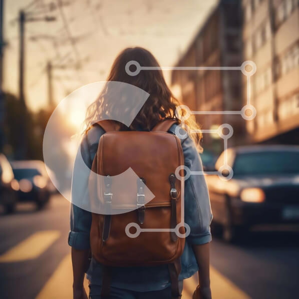 Intra Συλλεκτικό Ξύλινο Παζλ Plywood 4mm – Γυναίκα με καφέ δερμάτινο σακίδιο πλάτης που περπατά στην πόλη Σε Ξύλινο Κουτί – Διαστάσεις Puzzle: 10×10 cm – 25 κομμάτια