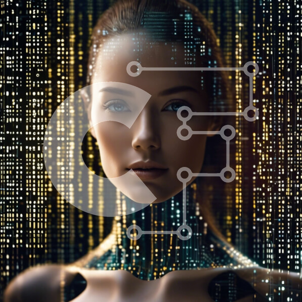 Intra Συλλεκτικό Ξύλινο Παζλ Plywood 4mm – Γυναίκα με σώμα τεχνητής νοημοσύνης (AI) μπροστά από πολύχρωμες ψηφιακές γραμμές Σε Ξύλινο Κουτί – Διαστάσεις Puzzle: 10×10 cm – 25 κομμάτια