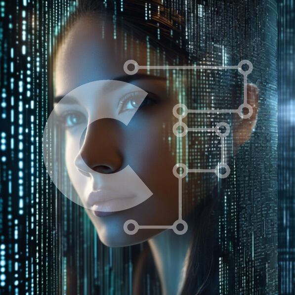 Intra Συλλεκτικό Ξύλινο Παζλ Plywood 4mm – Γυναίκα μπροστά από την ηλεκτρονική οθόνη με τις κωδικοποιημένες γραμμές Σε Ξύλινο Κουτί – Διαστάσεις Puzzle: 10×10 cm – 25 κομμάτια