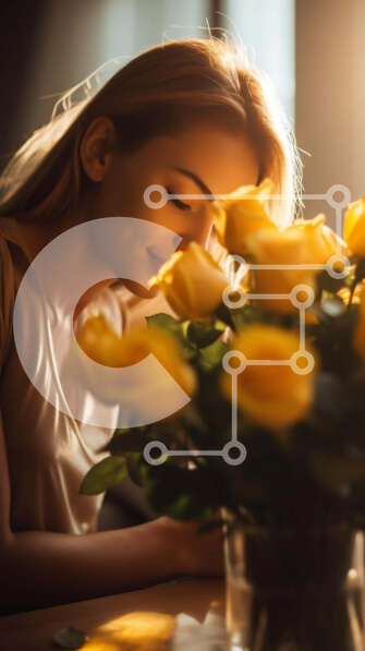 Intra Συλλεκτικό Ξύλινο Παζλ Plywood 4mm – Γυναίκα που μυρίζει κίτρινα τριαντάφυλλα στο τραπέζι Σε Ξύλινο Κουτί – Διαστάσεις Puzzle: 10×10 cm – 25 κομμάτια