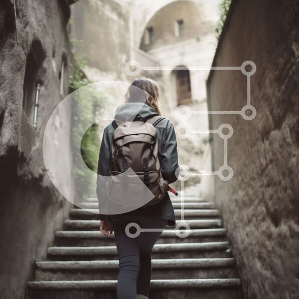 Intra Συλλεκτικό Ξύλινο Παζλ Plywood 4mm – Γυναίκα που περπατά κάτω από τις σκάλες στο Stone Alleyway με το σακίδιο Σε Ξύλινο Κουτί – Διαστάσεις Puzzle: 10×10 cm – 25 κομμάτια