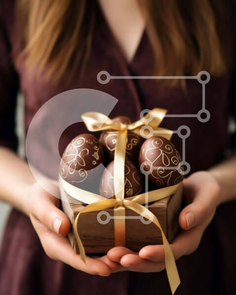 Intra Συλλεκτικό Ξύλινο Παζλ Plywood 4mm – Γυναίκα που κρατά ένα ξύλινο κουτί με σοκολατένια αυγά Πάσχας με χρυσές κορδέλες και φιόγκους Σε Ξύλινο Κουτί – Διαστάσεις: 10×10 cm – 25 κομμάτια