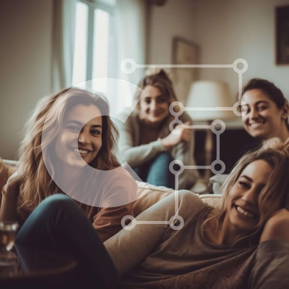 Intra Συλλεκτικό Ξύλινο Παζλ Plywood 4mm – Διασκέδαση και φιλία: Τέσσερις γυναίκες που γελούν σε έναν καναπέ στο σαλόνι Σε Ξύλινο Κουτί – Διαστάσεις Puzzle: 10×10 cm – 25 κομμάτια
