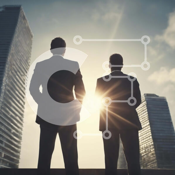 Intra Συλλεκτικό Ξύλινο Παζλ Plywood 4mm – Δύο επιχειρηματίες μπροστά από τον ουρανοξύστη με τον ήλιο Σε Ξύλινο Κουτί – Διαστάσεις Puzzle: 10×10 cm – 25 κομμάτια