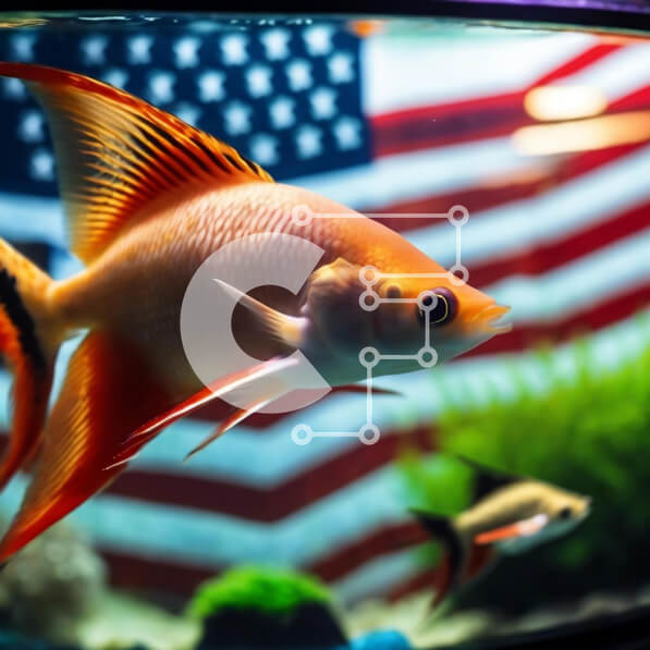 Intra Συλλεκτικό Ξύλινο Παζλ Plywood 4mm – Δύο ψάρια που κολυμπούν στο ενυδρείο με φόντο την αμερικανική σημαία Σε Ξύλινο Κουτί – Διαστάσεις: 10×10 cm – 25 κομμάτια
