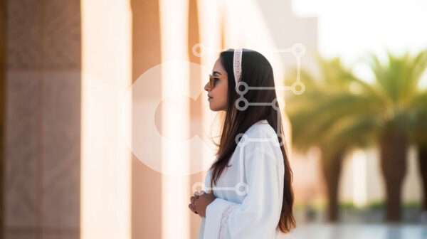 Intra Συλλεκτικό Ξύλινο Παζλ Plywood 4mm – Εικόνα μιας γυναίκας με λευκό φόρεμα που στέκεται μπροστά από ένα κτήριο με φοίνικες Σε Ξύλινο Κουτί – Διαστάσεις Puzzle: 10×10 cm – 25 κομμάτια