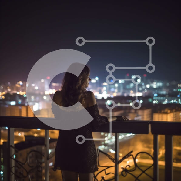 Intra Συλλεκτικό Ξύλινο Παζλ Plywood 4mm – Εκπληκτική θέα της πόλης τη νύχτα από το μπαλκόνι με τη γυναίκα με το μαύρο φόρεμα Σε Ξύλινο Κουτί – Διαστάσεις Puzzle: 10×10 cm – 25 κομμάτια