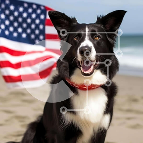Intra Συλλεκτικό Ξύλινο Παζλ Plywood 4mm – Ευτυχισμένος ασπρόμαυρος σκύλος στην παραλία με την αμερικανική σημαία Σε Ξύλινο Κουτί – Διαστάσεις: 10×10 cm – 25 κομμάτια
