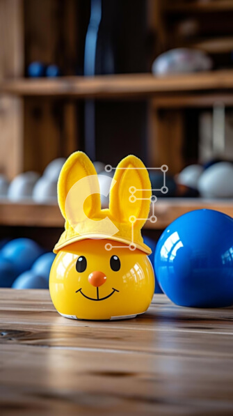 Intra Συλλεκτικό Ξύλινο Παζλ Plywood 4mm – Κίτρινο παιχνίδι σε σχήμα λαγουδάκι και μπλε μπάλες σε ξύλινο τραπέζι Σε Ξύλινο Κουτί – Διαστάσεις: 10×10 cm – 25 κομμάτια