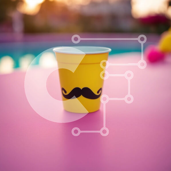 Intra Συλλεκτικό Ξύλινο Παζλ Plywood 4mm – Κίτρινο χάρτινο κύπελλο με σχέδιο μουστάκι σε ροζ τραπέζι δίπλα στην πισίνα Σε Ξύλινο Κουτί – Διαστάσεις: 10×10 cm – 25 κομμάτια