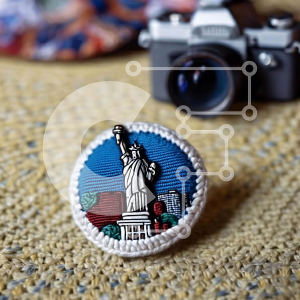 Intra Συλλεκτικό Ξύλινο Παζλ Plywood 4mm – Καρφίτσα άγαλμα της ελευθερίας σε πορτοκαλί χαλί με κάμερα Σε Ξύλινο Κουτί – Διαστάσεις Puzzle: 10×10 cm – 25 κομμάτια