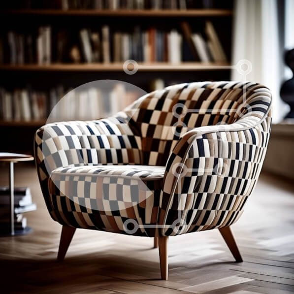 Intra Συλλεκτικό Ξύλινο Παζλ Plywood 4mm – Κομψή ασπρόμαυρη καρό πολυθρόνα σε ένα καλά φωτισμένο δωμάτιο με δάπεδα από σκληρό ξύλο και ράφι Σε Ξύλινο Κουτί – Διαστάσεις Puzzle: 10×10 cm – 25 κομμάτια