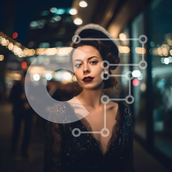Intra Συλλεκτικό Ξύλινο Παζλ Plywood 4mm – Κομψή γυναίκα με μαύρο φόρεμα και καπέλο που στέκεται στην πολυσύχναστη οδό της πόλης τη νύχτα Σε Ξύλινο Κουτί – Διαστάσεις: 10×10 cm – 25 κομμάτια