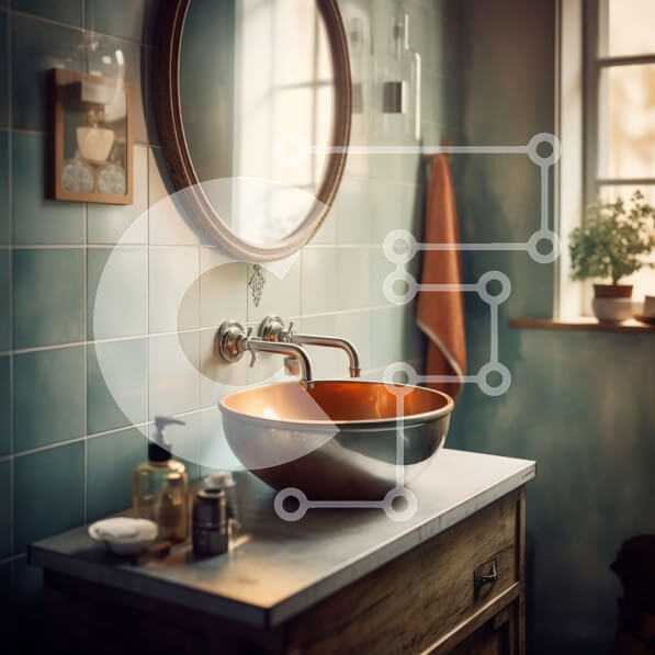 Intra Συλλεκτικό Ξύλινο Παζλ Plywood 4mm – Κομψό μπάνιο με χάλκινο νεροχύτη και πράσινα πλακάκια Σε Ξύλινο Κουτί – Διαστάσεις Puzzle: 10×10 cm – 25 κομμάτια