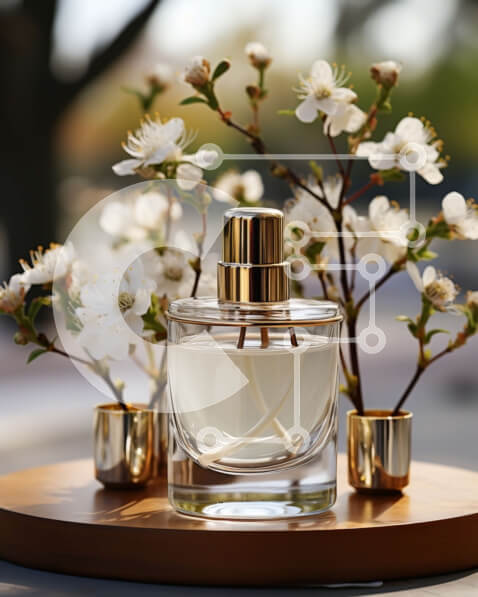 Intra Συλλεκτικό Ξύλινο Παζλ Plywood 4mm – Κομψό μπουκάλι αρώματος με ετικέτα με άνθη κερασιάς σε ξύλινο δίσκο Σε Ξύλινο Κουτί – Διαστάσεις Puzzle: 10×10 cm – 25 κομμάτια