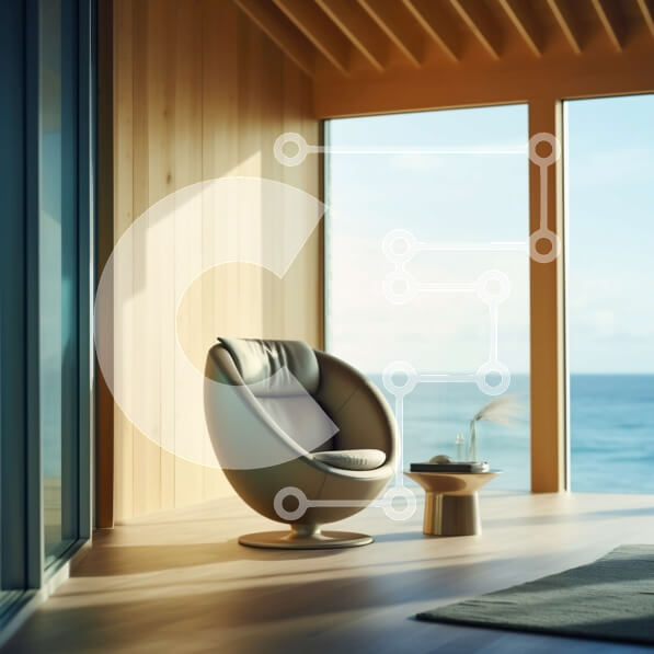 Intra Συλλεκτικό Ξύλινο Παζλ Plywood 4mm – Κομψό σαλόνι με θέα στον ωκεανό και λευκή δερμάτινη καρέκλα Σε Ξύλινο Κουτί – Διαστάσεις Puzzle: 10×10 cm – 25 κομμάτια