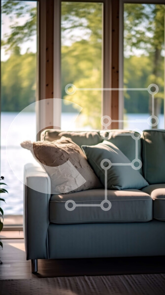 Intra Συλλεκτικό Ξύλινο Παζλ Plywood 4mm – Κομψό σαλόνι με μπλε καναπέ και εκπληκτική θέα στη λίμνη Σε Ξύλινο Κουτί – Διαστάσεις Puzzle: 10×10 cm – 25 κομμάτια