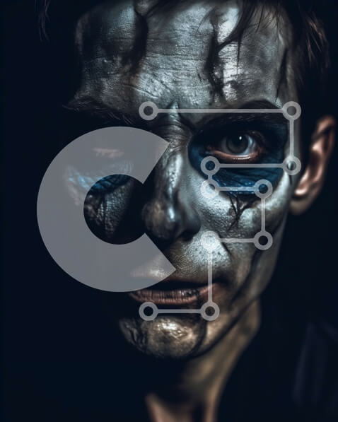 Intra Συλλεκτικό Ξύλινο Παζλ Plywood 4mm – Κοντινό πλάνο του προσώπου του ανθρώπου με μπλε και μαύρο σκελετό κοστούμι μακιγιάζ Σε Ξύλινο Κουτί – Διαστάσεις Puzzle: 10×10 cm – 25 κομμάτια