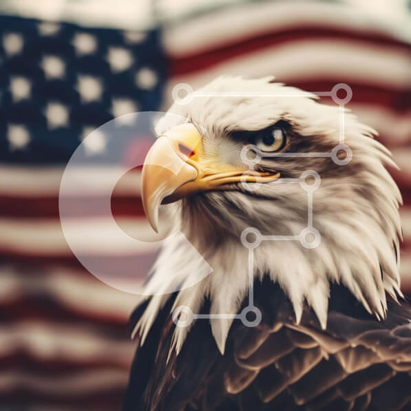 Intra Συλλεκτικό Ξύλινο Παζλ Plywood 4mm – Κοντινό πλάνο του αετού μπροστά από την αμερικανική σημαία Σε Ξύλινο Κουτί – Διαστάσεις: 10×10 cm – 25 κομμάτια