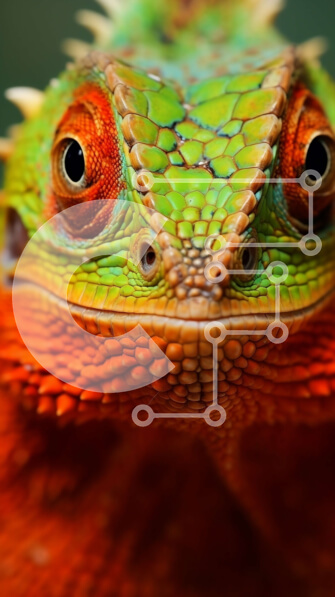 Intra Συλλεκτικό Ξύλινο Παζλ Plywood 4mm – Κοντινό πλάνο μιας πορτοκαλί και πράσινης σαύρας που κοιτάζει επίμονα τον θεατή Σε Ξύλινο Κουτί – Διαστάσεις: 10×10 cm – 25 κομμάτια