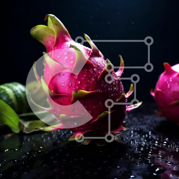 Intra Συλλεκτικό Ξύλινο Παζλ Plywood 4mm – Κοντινό πλάνο δύο φρούτων δράκων με σταγονίδια νερού σε μαύρο φόντο Σε Ξύλινο Κουτί – Διαστάσεις: 10×10 cm – 25 κομμάτια