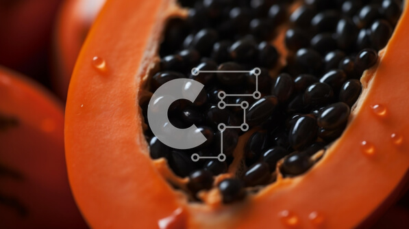 Intra Συλλεκτικό Ξύλινο Παζλ Plywood 4mm – Κοντινό πλάνο πορτοκαλί παπάγιας με μαύρους σπόρους Σε Ξύλινο Κουτί – Διαστάσεις: 10×10 cm – 25 κομμάτια
