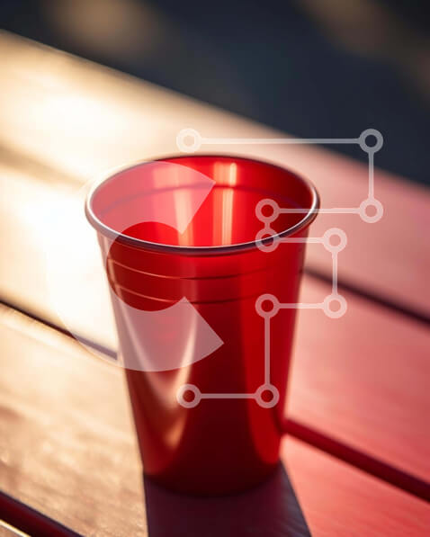 Intra Συλλεκτικό Ξύλινο Παζλ Plywood 4mm – Κόκκινο πλαστικό κύπελλο σε εξωτερικό ξύλινο τραπέζι Σε Ξύλινο Κουτί – Διαστάσεις: 10×10 cm – 25 κομμάτια