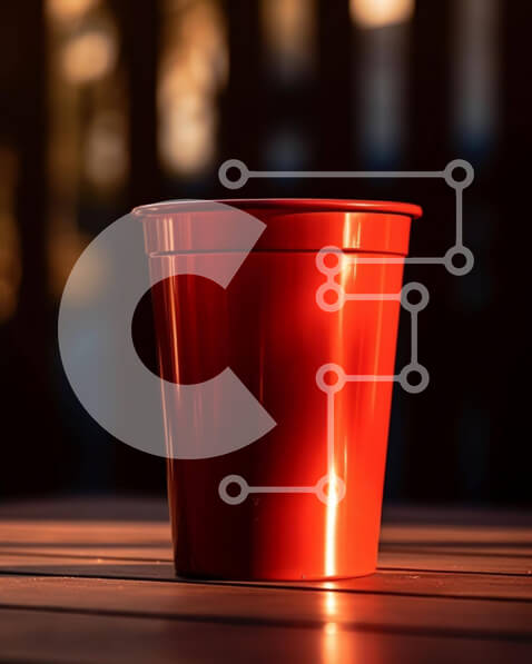 Intra Συλλεκτικό Ξύλινο Παζλ Plywood 4mm – Κόκκινο πλαστικό κύπελλο σε εξωτερικό ξύλινο τραπέζι Σε Ξύλινο Κουτί – Διαστάσεις: 10×10 cm – 25 κομμάτια