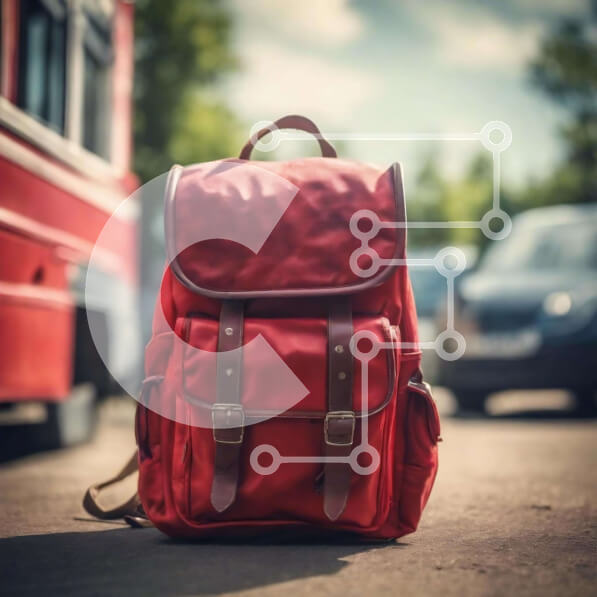 Intra Συλλεκτικό Ξύλινο Παζλ Plywood 4mm – Κόκκινο σακίδιο πλάτης σε αστικό περιβάλλον με αυτοκίνητα και λεωφορεία Σε Ξύλινο Κουτί – Διαστάσεις: 10×10 cm – 25 κομμάτια