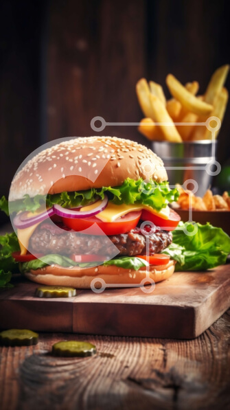 Intra Συλλεκτικό Ξύλινο Παζλ Plywood 4mm – Λαχταριστή εικόνα από χάμπουργκερ και πατάτες στο ξύλινο τραπέζι Σε Ξύλινο Κουτί – Διαστάσεις: 10×10 cm – 25 κομμάτια
