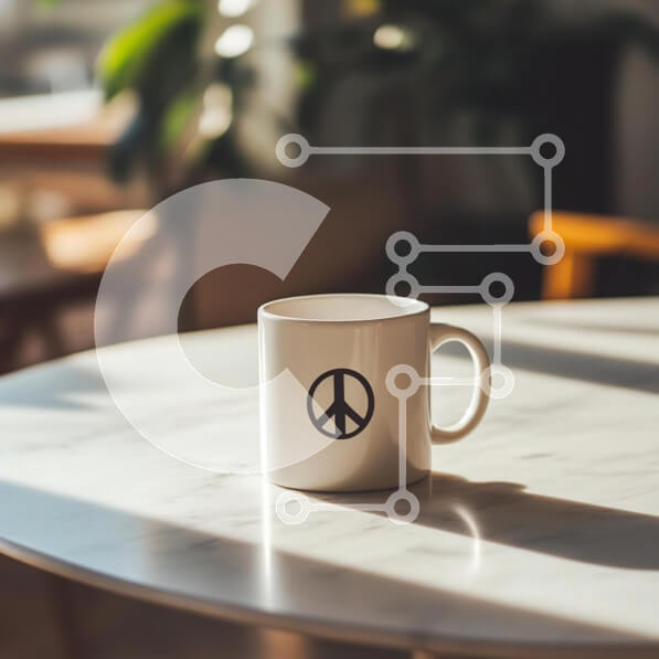Intra Συλλεκτικό Ξύλινο Παζλ Plywood 4mm – Λευκή κούπα με σύμβολο ειρήνης σε μαρμάρινο τραπέζι Σε Ξύλινο Κουτί – Διαστάσεις Puzzle: 10×10 cm – 25 κομμάτια