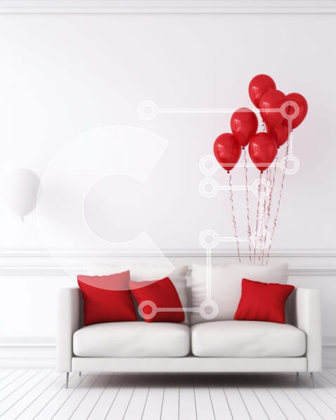 Intra Συλλεκτικό Ξύλινο Παζλ Plywood 4mm – Λευκός καναπές με κόκκινα μπαλόνια που κρέμονται από την οροφή Σε Ξύλινο Κουτί – Διαστάσεις Puzzle: 10×10 cm – 25 κομμάτια
