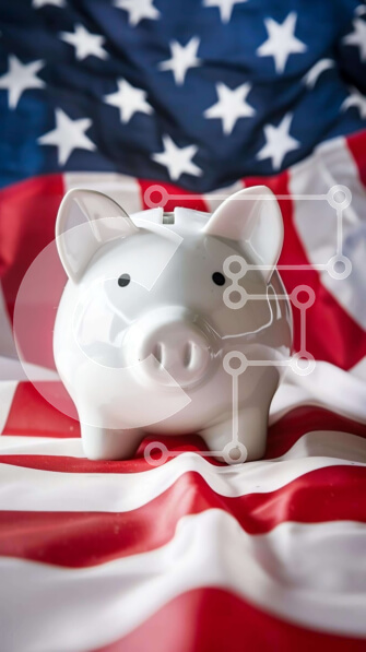 Intra Συλλεκτικό Ξύλινο Παζλ Plywood 4mm – Λευκός κουμπαράς σε αμερικανική σημαία με προμήθειες γραφείου Σε Ξύλινο Κουτί – Διαστάσεις: 10×10 cm – 25 κομμάτια
