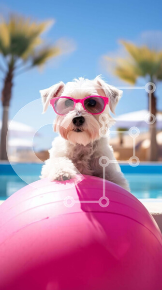 Intra Συλλεκτικό Ξύλινο Παζλ Plywood 4mm – Λευκός σκύλος με γυαλιά ηλίου σε φουσκωτή ροζ μπάλα δίπλα στην πισίνα Σε Ξύλινο Κουτί – Διαστάσεις: 10×10 cm – 25 κομμάτια
