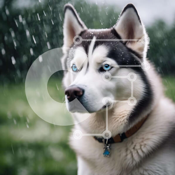 Intra Συλλεκτικό Ξύλινο Παζλ Plywood 4mm – Λευκό και μαύρο γεροδεμένο σκυλί με μπλε μάτια στη βροχή Σε Ξύλινο Κουτί – Διαστάσεις: 10×10 cm – 25 κομμάτια