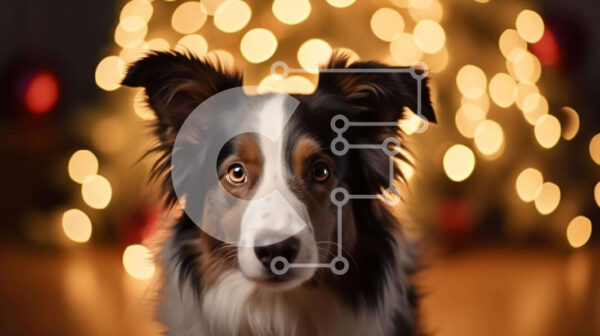 Intra Συλλεκτικό Ξύλινο Παζλ Plywood 4mm – Μαύρο και άσπρο σκυλί μπροστά από το φωτισμένο χριστουγεννιάτικο δέντρο Σε Ξύλινο Κουτί – Διαστάσεις: 10×10 cm – 25 κομμάτια