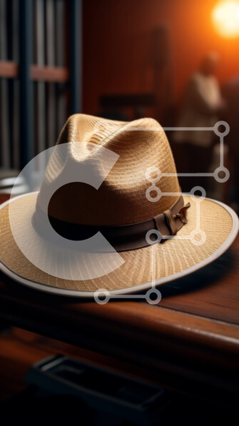 Intra Συλλεκτικό Ξύλινο Παζλ Plywood 4mm – Μαύρο καπέλο σε ξύλινο τραπέζι με θέα στον ορίζοντα της πόλης στο ηλιοβασίλεμα Σε Ξύλινο Κουτί – Διαστάσεις Puzzle: 10×10 cm – 25 κομμάτια