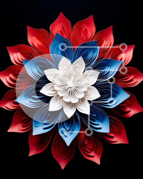 Intra Συλλεκτικό Ξύλινο Παζλ Plywood 4mm – Μεγάλο χάρτινο λουλούδι σε κόκκινο, λευκό και μπλε σε μαύρο φόντο Σε Ξύλινο Κουτί – Διαστάσεις Puzzle: 10×10 cm – 25 κομμάτια