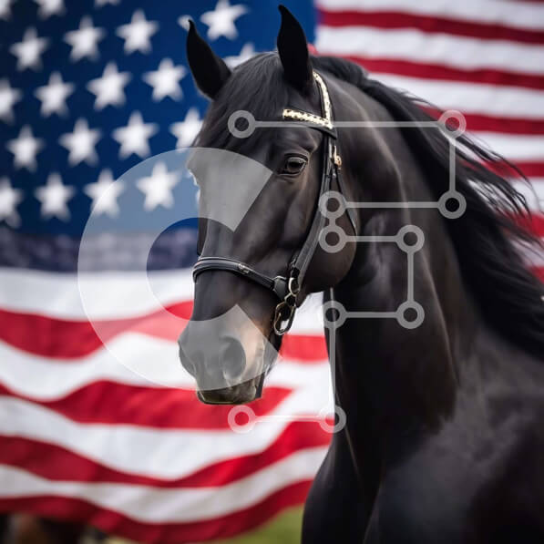Intra Συλλεκτικό Ξύλινο Παζλ Plywood 4mm – Μεγαλοπρεπές μαύρο άλογο μπροστά από την αμερικανική σημαία Σε Ξύλινο Κουτί – Διαστάσεις: 10×10 cm – 25 κομμάτια