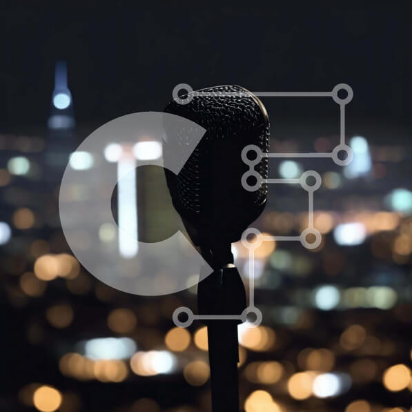 Intra Συλλεκτικό Ξύλινο Παζλ Plywood 4mm – Μικρόφωνο μπροστά από το φωτισμένο αστικό τοπίο τη νύχτα Σε Ξύλινο Κουτί – Διαστάσεις Puzzle: 10×10 cm – 25 κομμάτια