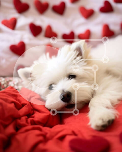 Intra Συλλεκτικό Ξύλινο Παζλ Plywood 4mm – Μικρό λευκό σκυλί στο κρεβάτι με κόκκινες καρδιές Σε Ξύλινο Κουτί – Διαστάσεις: 10×10 cm – 25 κομμάτια